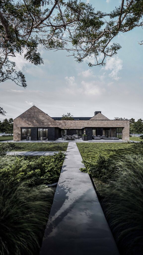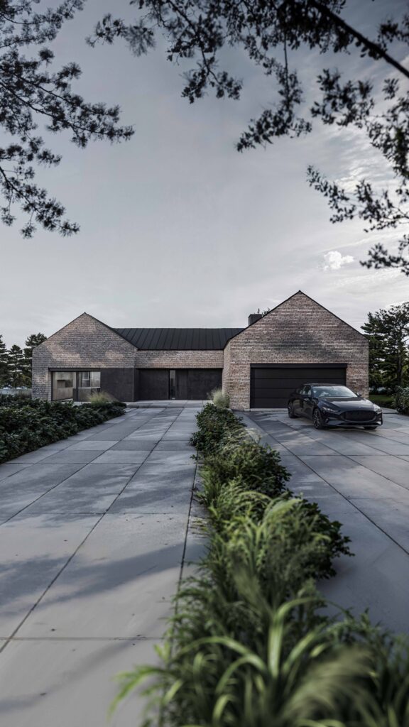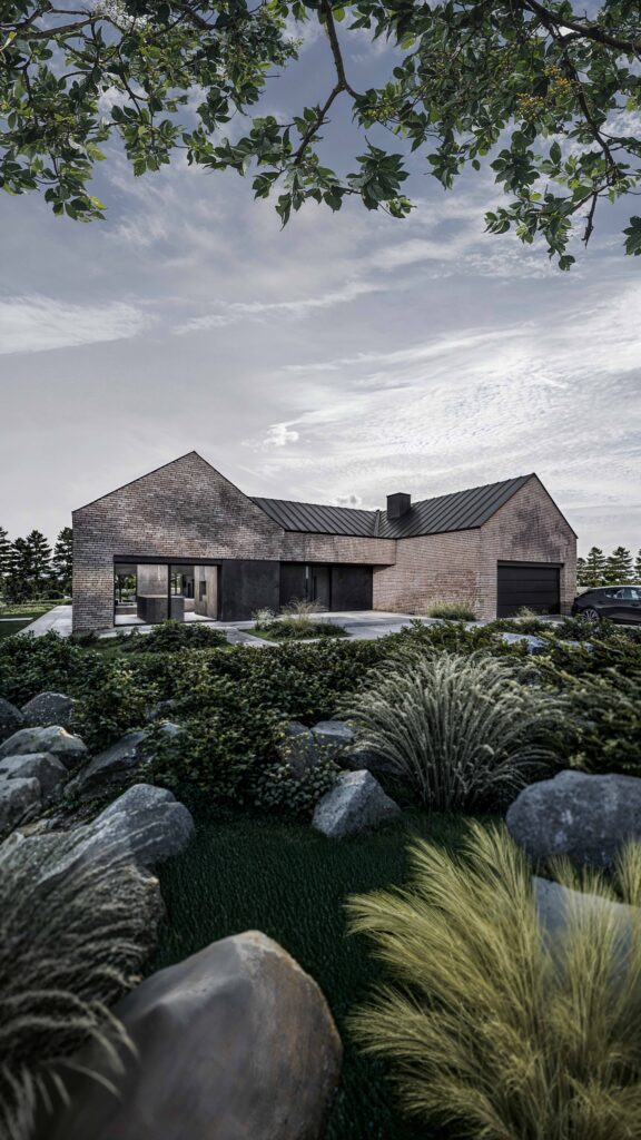 Bryła budynku oparta została na prostym rzucie, podkreślonym wyraźną geometrią i głębokimi podcięciami, które nadają całości nowoczesny, architektoniczny charakter. Elewacje wykonane z ręcznie formowanej cegły w połączeniu z grafitowym tynkiem tworzą stonowaną, elegancką kompozycję, subtelnie reagującą na światło i otoczenie.