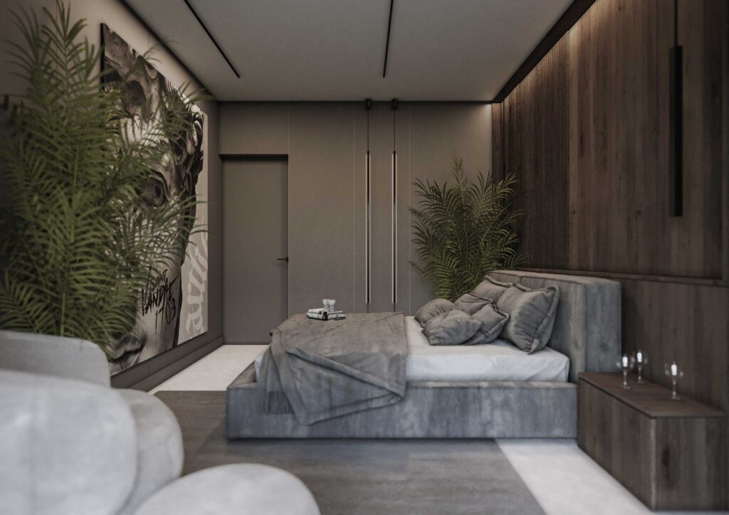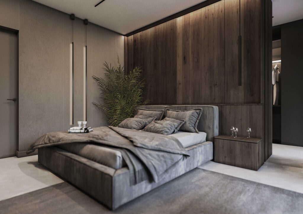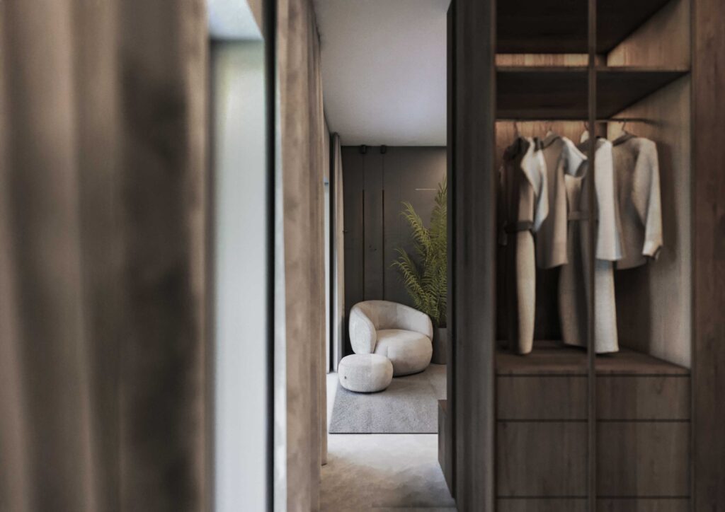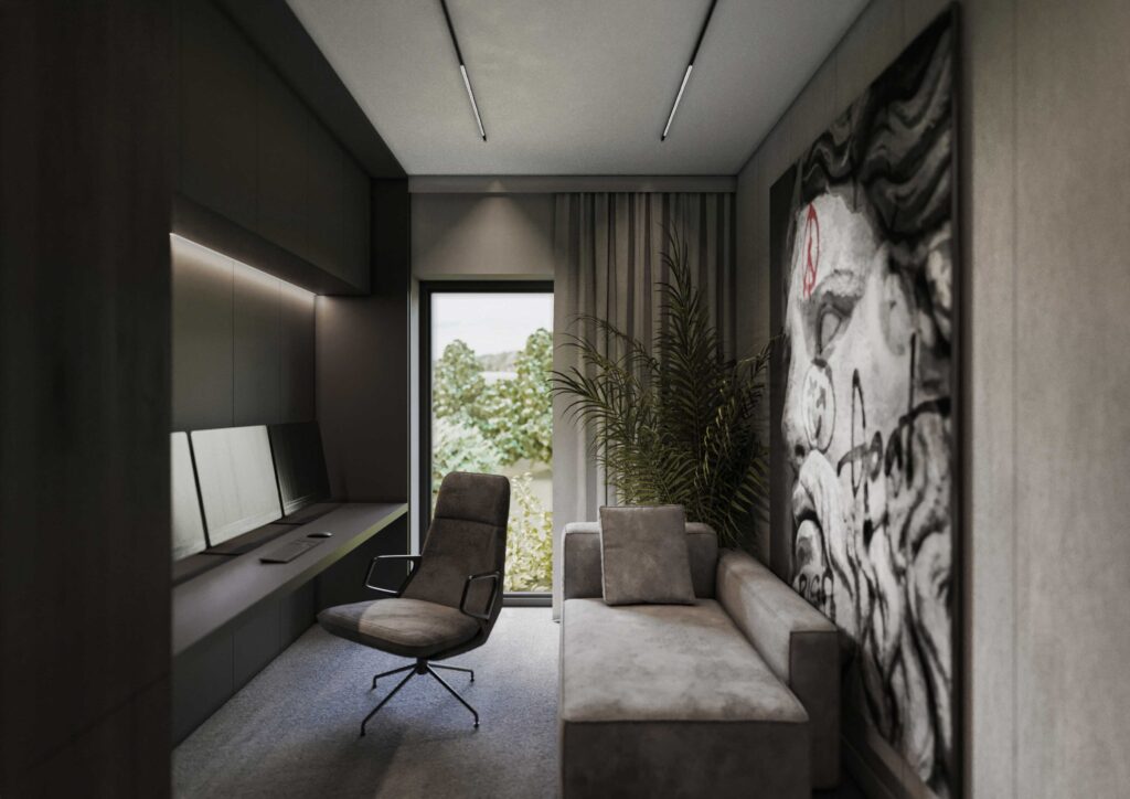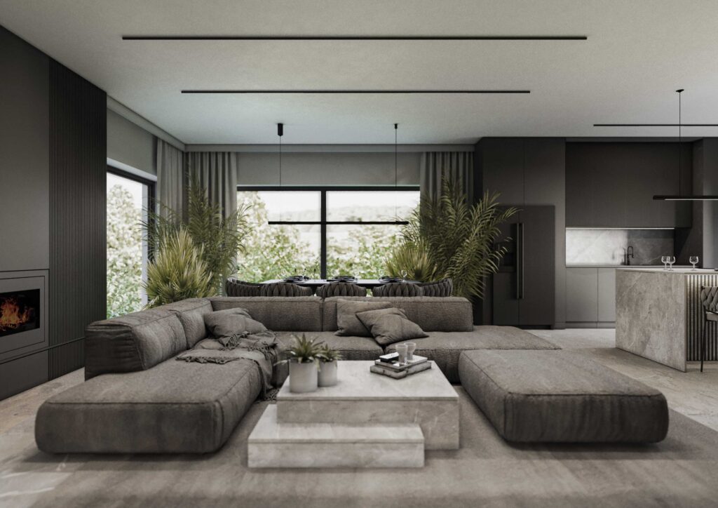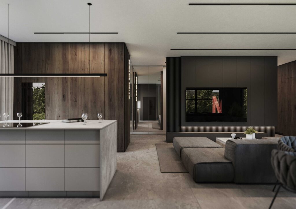 Wnętrza zostały zaprojektowane w oparciu o kontrast ciemnego drewna oraz jasnych i głębokich odcieni szarości. Ciemne, wertykalne okładziny drewniane nadają przestrzeni rytm i architektoniczną głębię, jednocześnie budując poczucie elegancji i intymności. Jasna szarość posadzek, sufitów i wybranych płaszczyzn równoważy ciężar materiałów, otwierając wnętrze na światło i potęgując wrażenie przestronności.