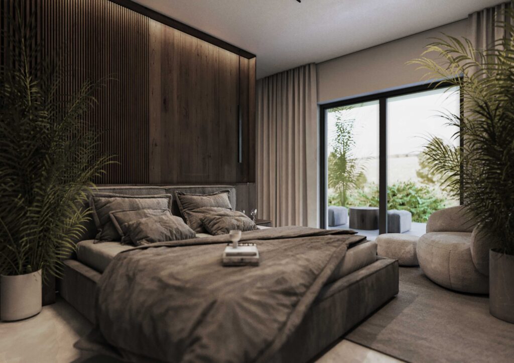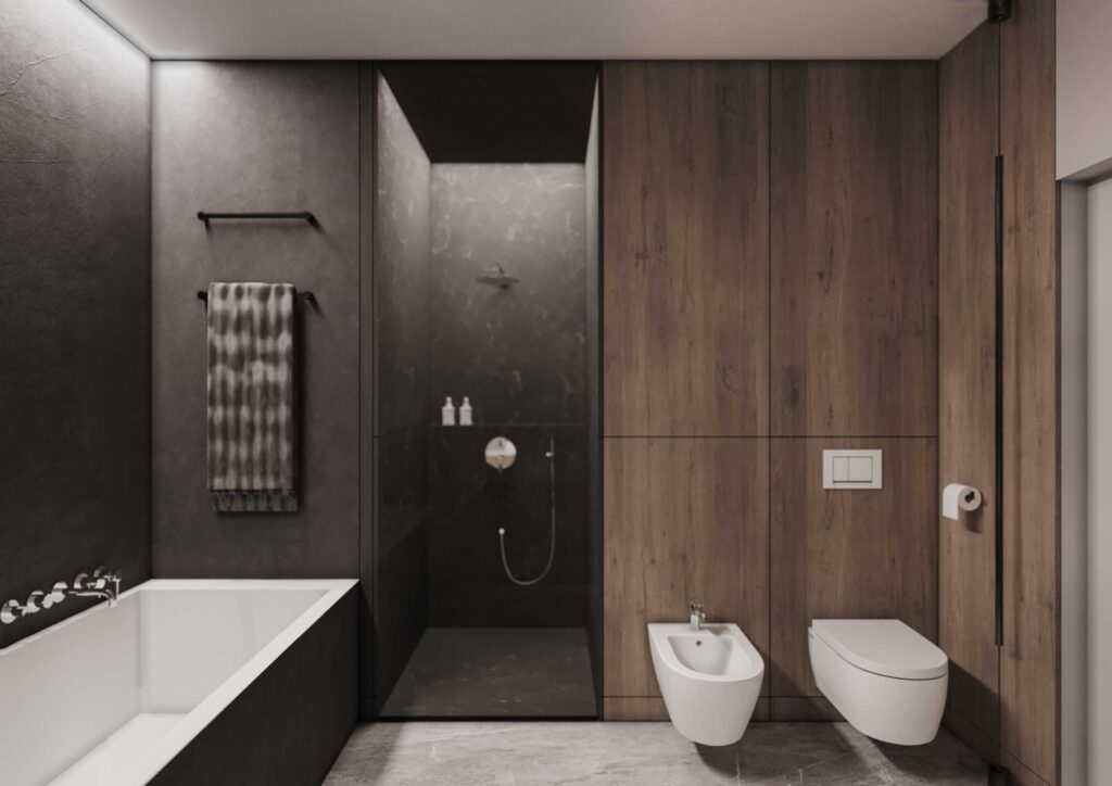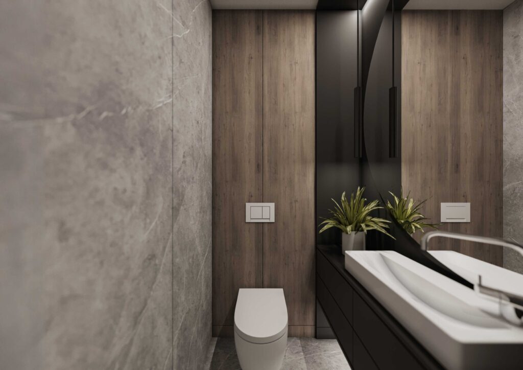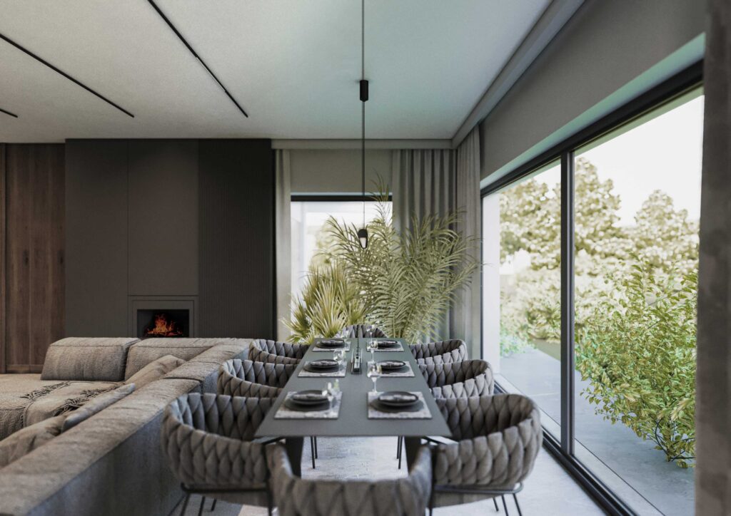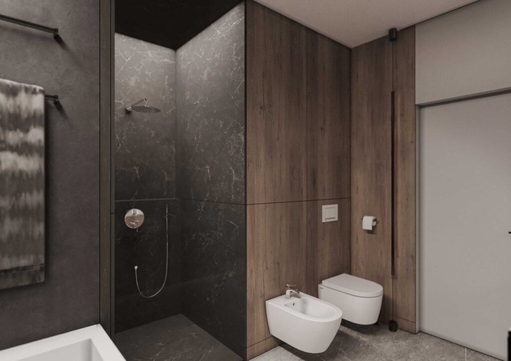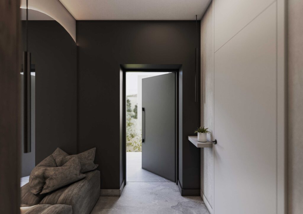 Wnętrza zostały zaprojektowane w oparciu o kontrast ciemnego drewna oraz jasnych i głębokich odcieni szarości. Ciemne, wertykalne okładziny drewniane nadają przestrzeni rytm i architektoniczną głębię, jednocześnie budując poczucie elegancji i intymności. Jasna szarość posadzek, sufitów i wybranych płaszczyzn równoważy ciężar materiałów, otwierając wnętrze na światło i potęgując wrażenie przestronności.