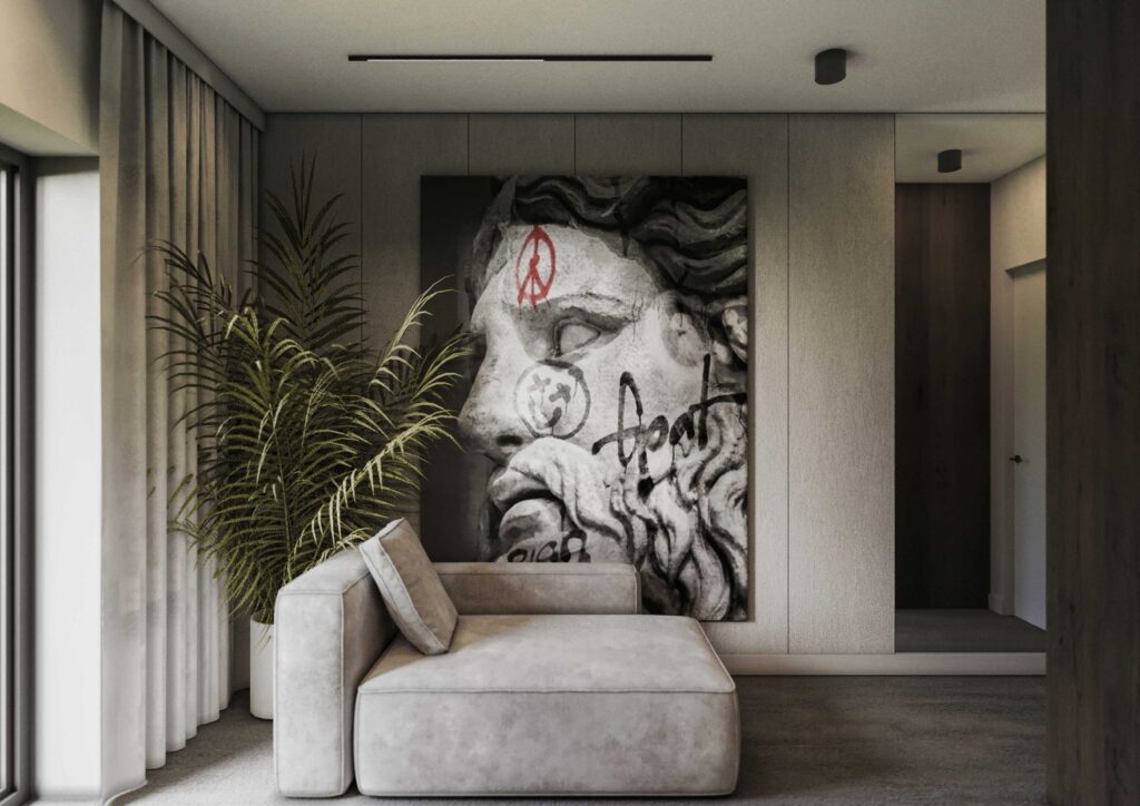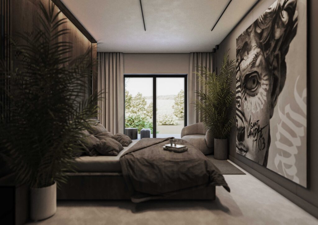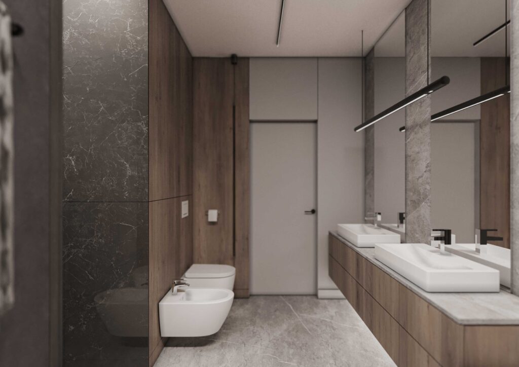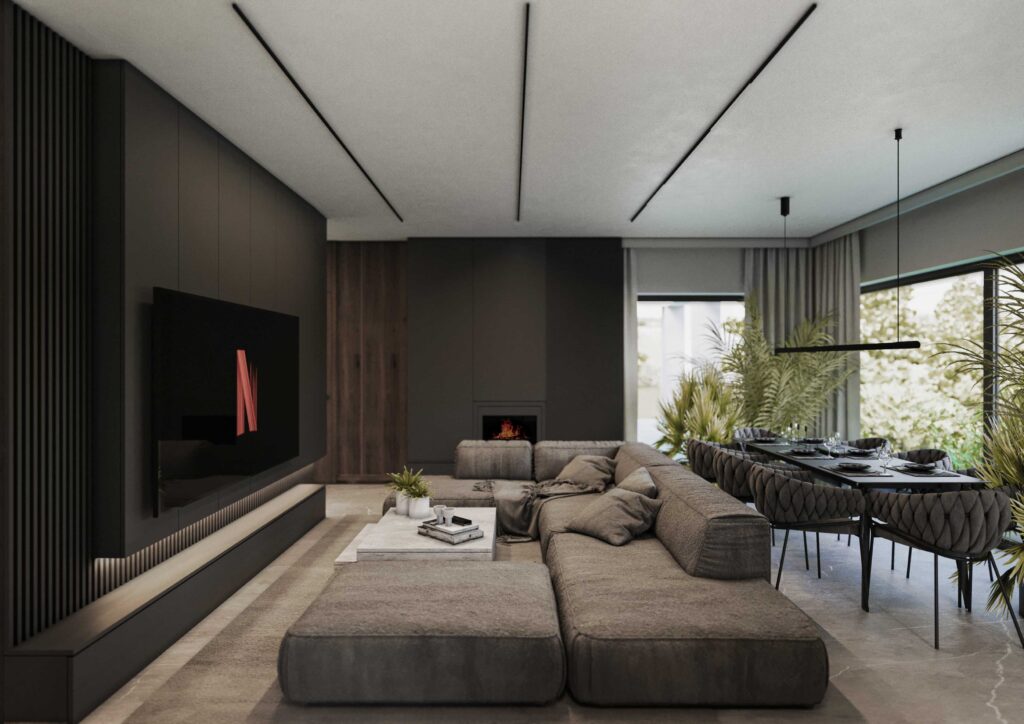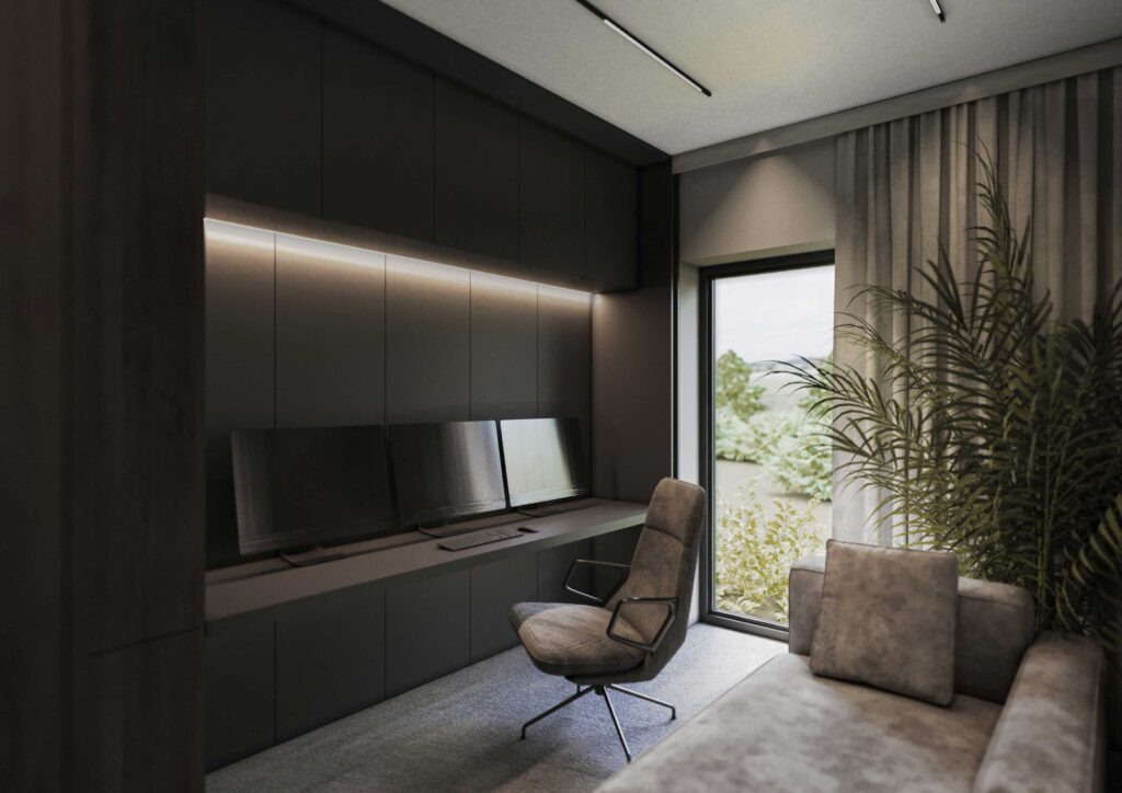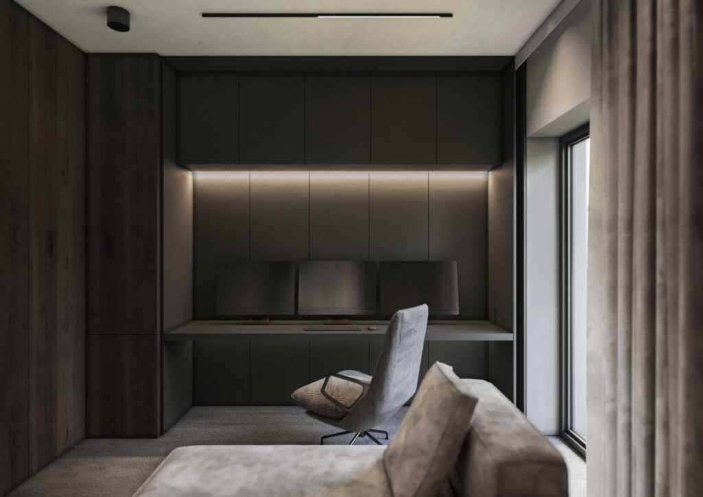 Oświetlenie zaprojektowano w sposób dyskretny i funkcjonalny – liniowe oprawy oraz subtelne punkty świetlne podkreślają geometrię wnętrza, faktury materiałów i architektoniczne podziały przestrzeni. Całość tworzy spójne, eleganckie wnętrze o wyraźnym, nowoczesnym charakterze, zaprojektowane z myślą o komforcie codziennego życia i wysokiej jakości estetycznej.