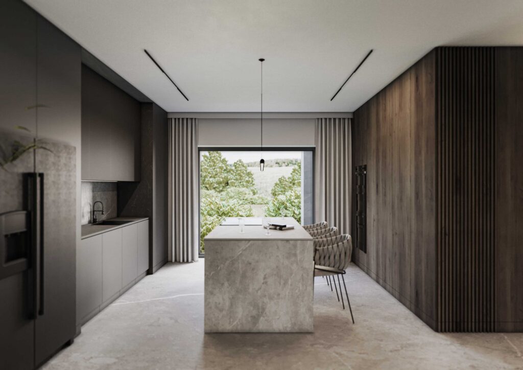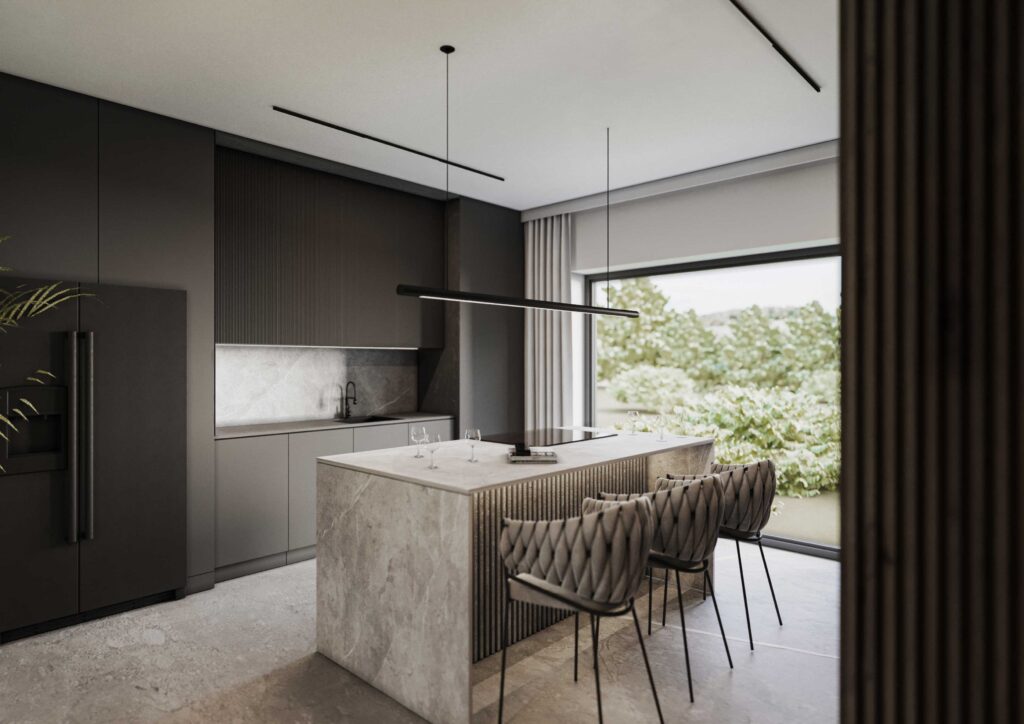 Centralną część domu stanowi otwarta strefa dzienna, w której kuchnia, jadalnia i salon tworzą spójną, płynnie przenikającą się przestrzeń. Kamienna wyspa kuchenna pełni funkcję zarówno użytkową, jak i kompozycyjną, porządkując układ wnętrza i stanowiąc naturalny punkt odniesienia dla pozostałych stref. Minimalistyczne zabudowy meblowe, projektowane na wymiar, pozwalają zachować czystość formy i spójność estetyczną.