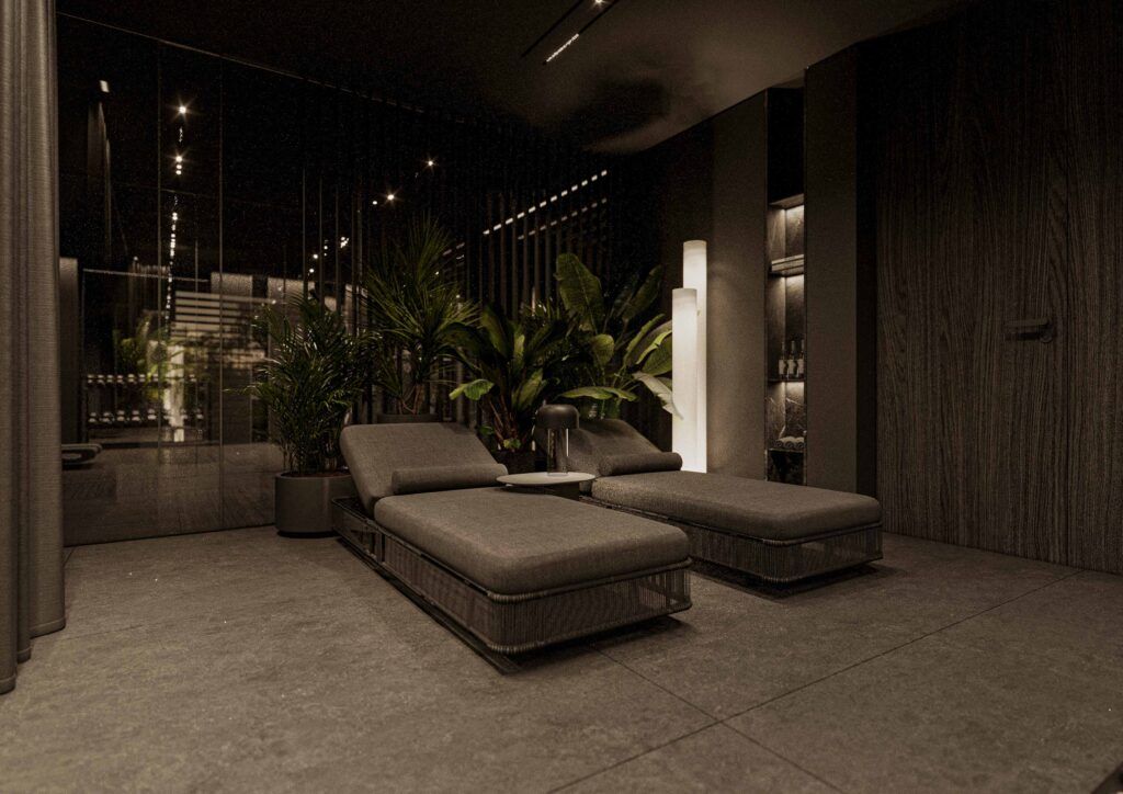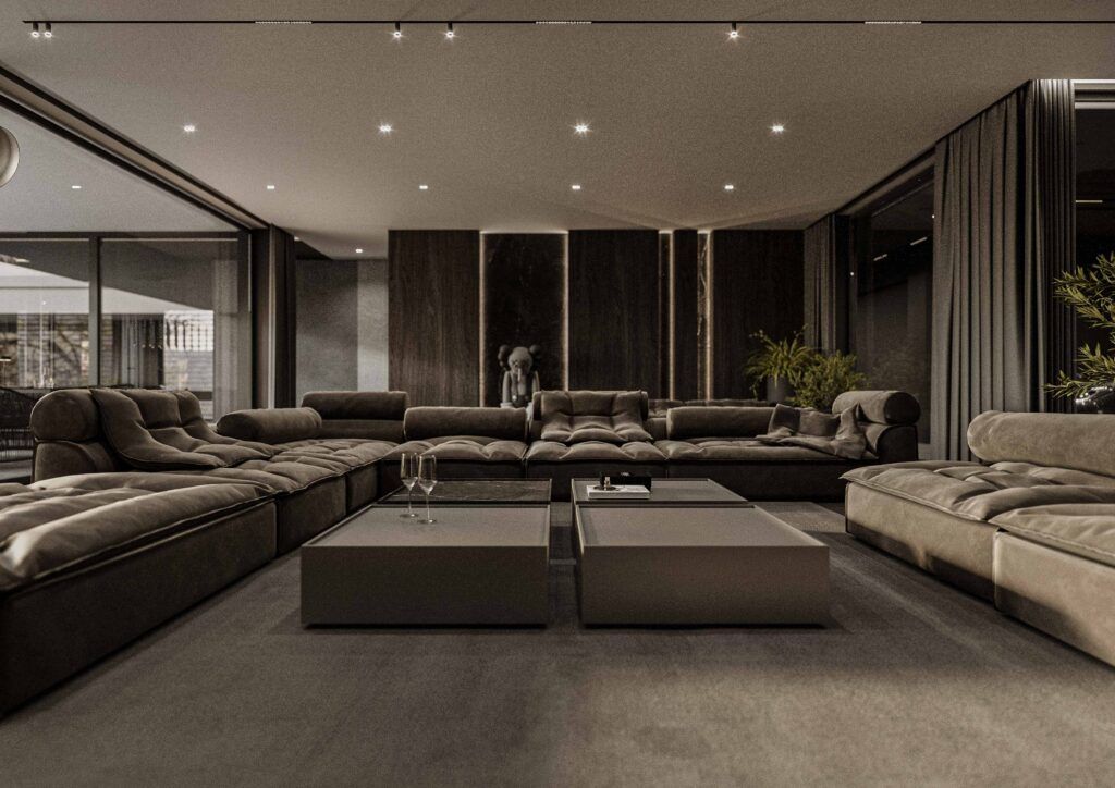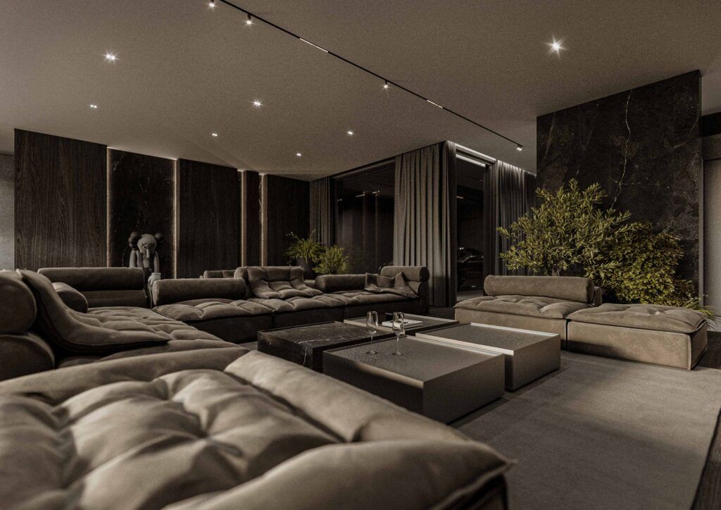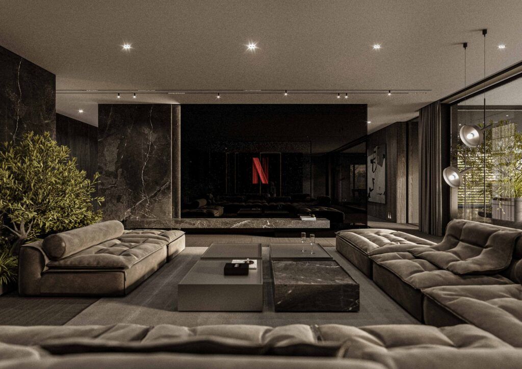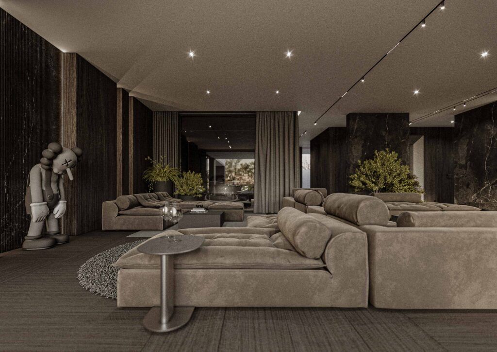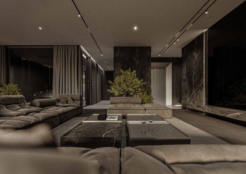 jednocześnie budując silną relację między architekturą a otoczeniem. Naturalne materiały, miękkie formy mebli oraz wielowarstwowe oświetlenie tworzą atmosferę komfortu i wyciszenia.
