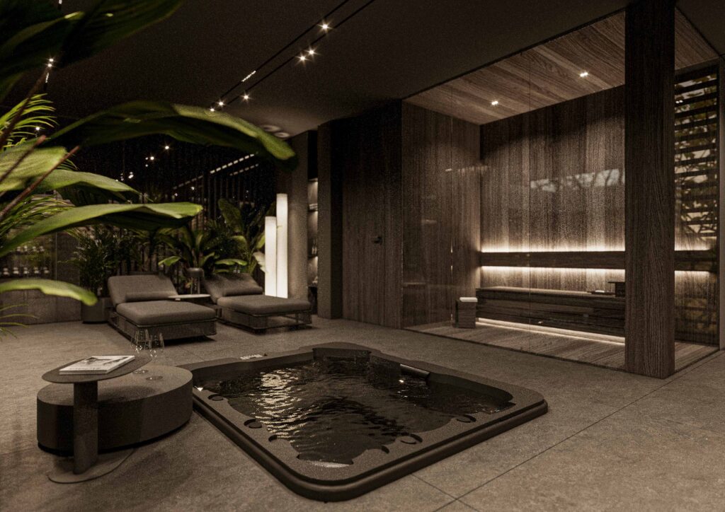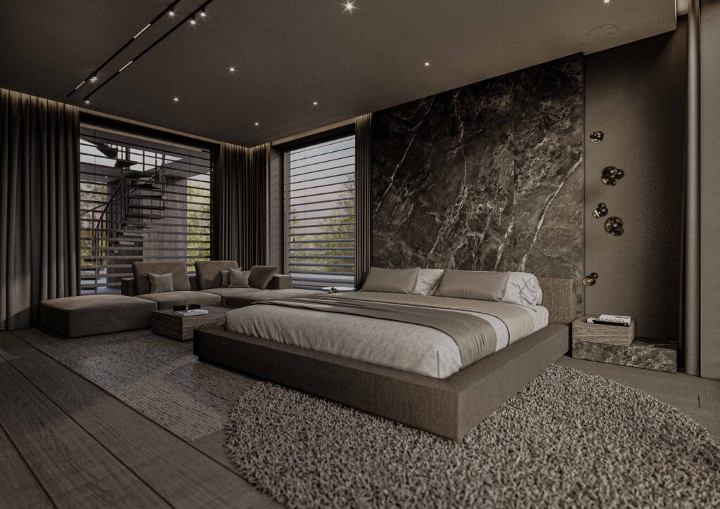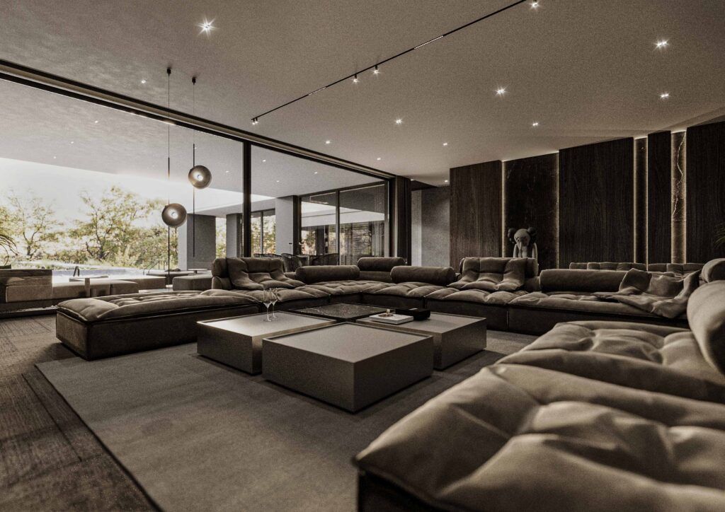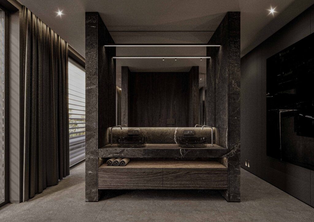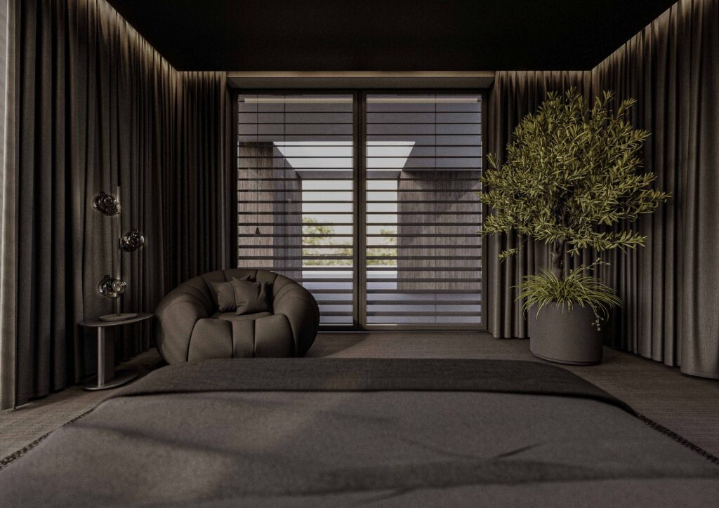jednocześnie budując silną relację między architekturą a otoczeniem. Naturalne materiały, miękkie formy mebli oraz wielowarstwowe oświetlenie tworzą atmosferę komfortu i wyciszenia.