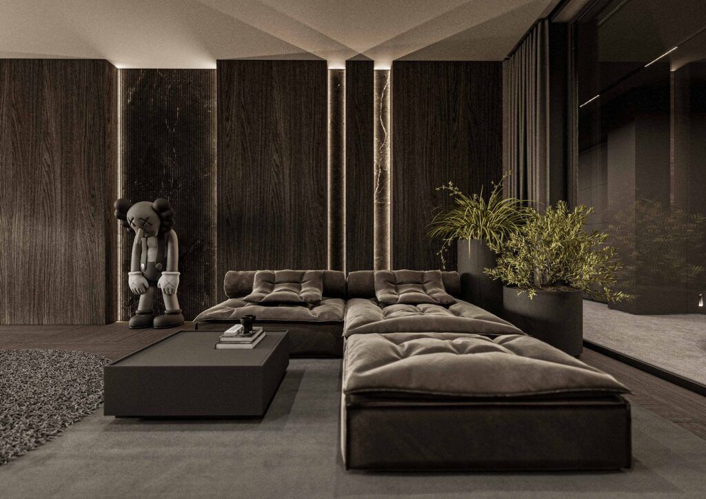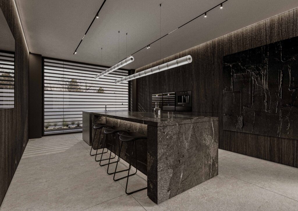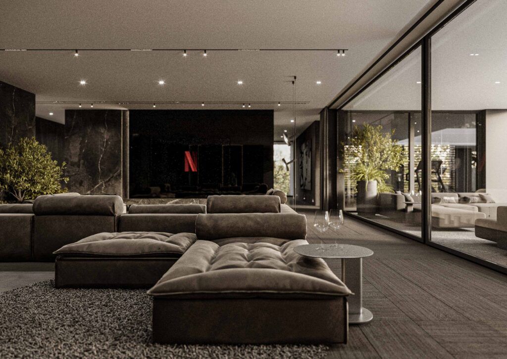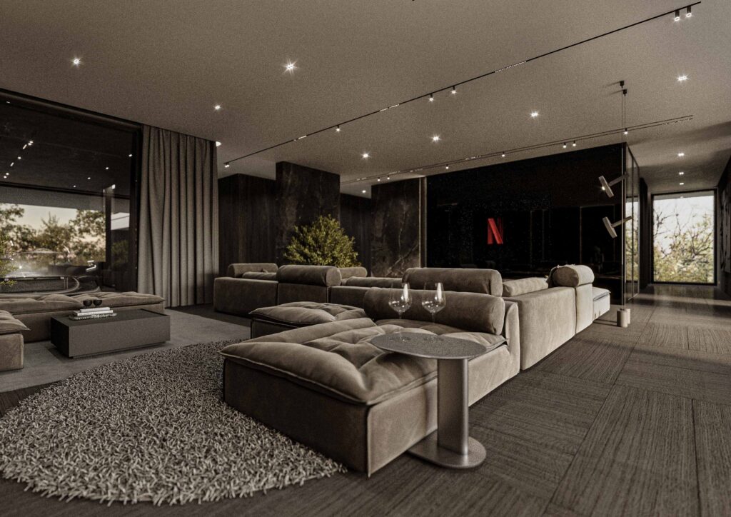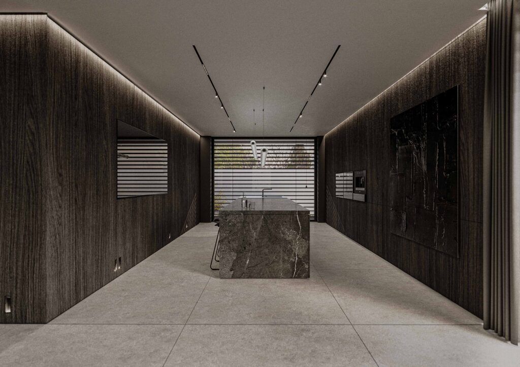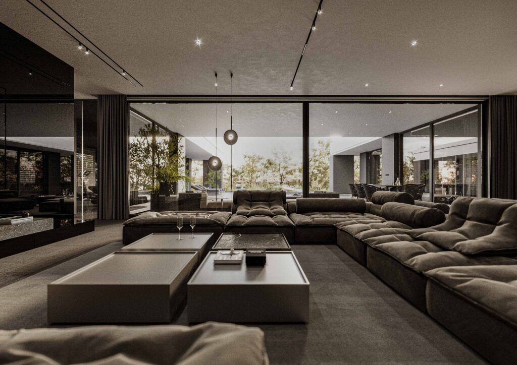 Wnętrza utrzymane są w ciemnej, nastrojowej tonacji, podkreślającej reprezentacyjny charakter rezydencji. Przestronna strefa dzienna z panoramicznym przeszkleniem otwiera dom na ogród,