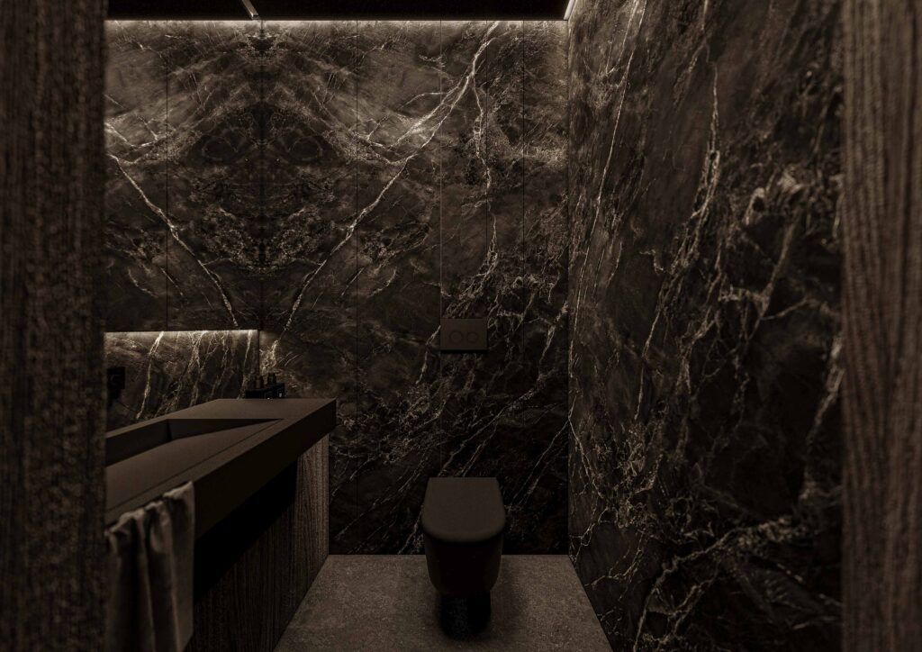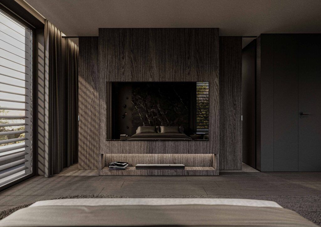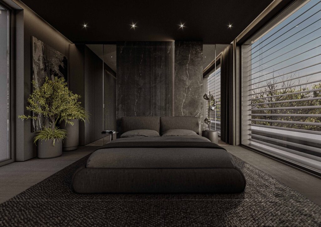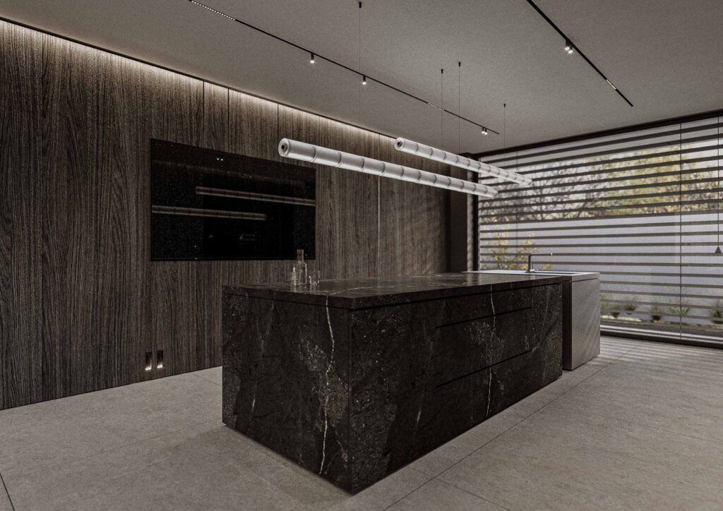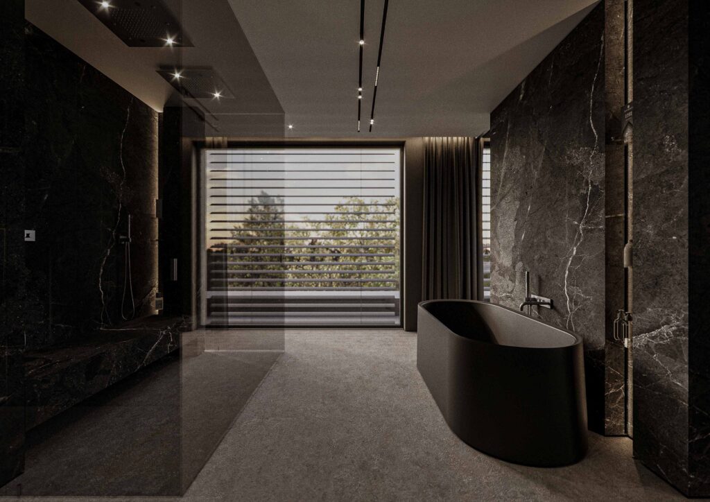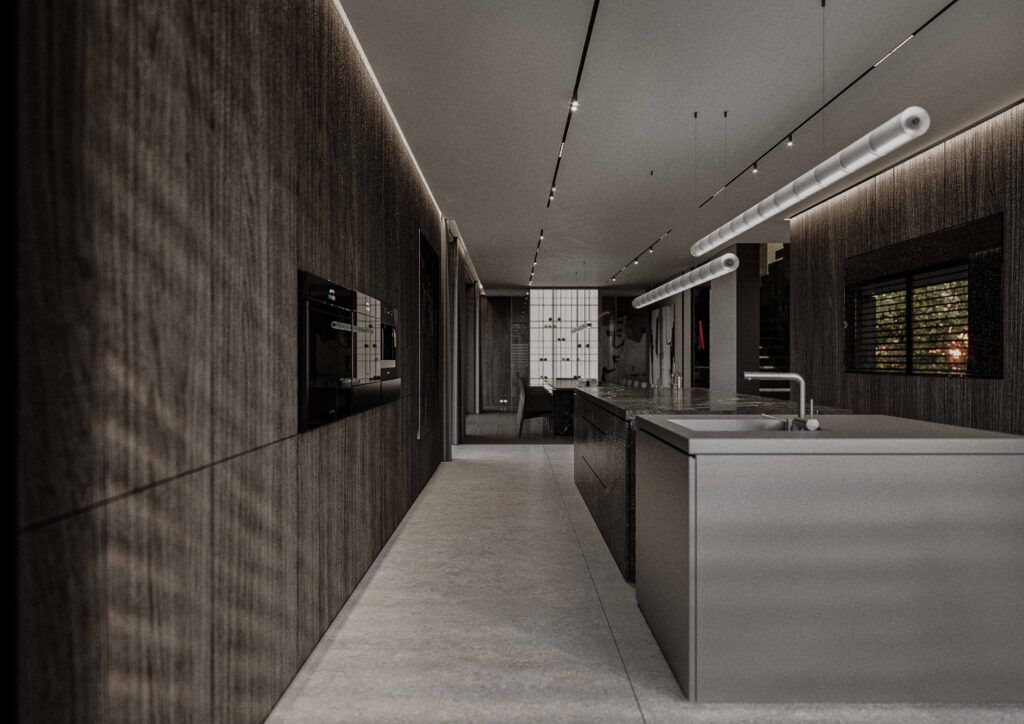 Wnętrza utrzymane są w ciemnej, nastrojowej tonacji, podkreślającej reprezentacyjny charakter rezydencji. Przestronna strefa dzienna z panoramicznym przeszkleniem otwiera dom na ogród,