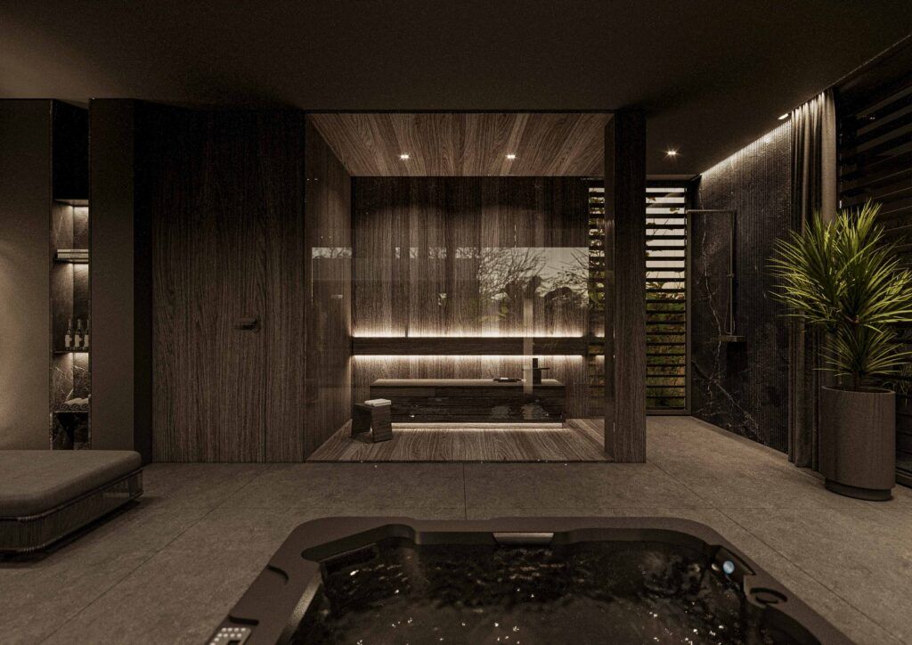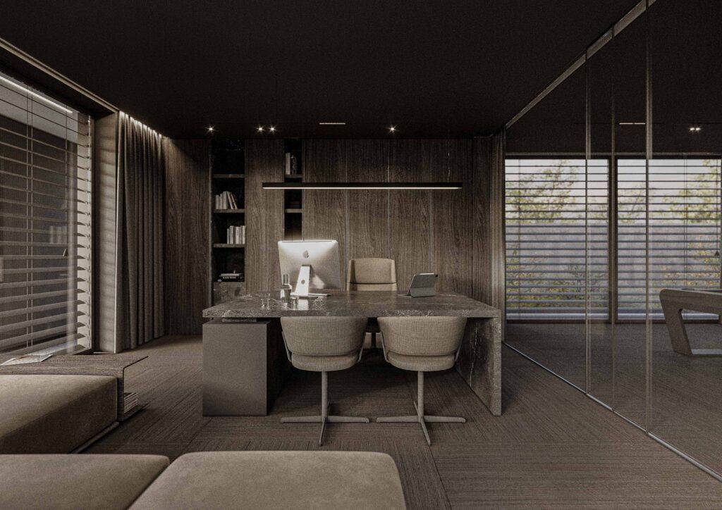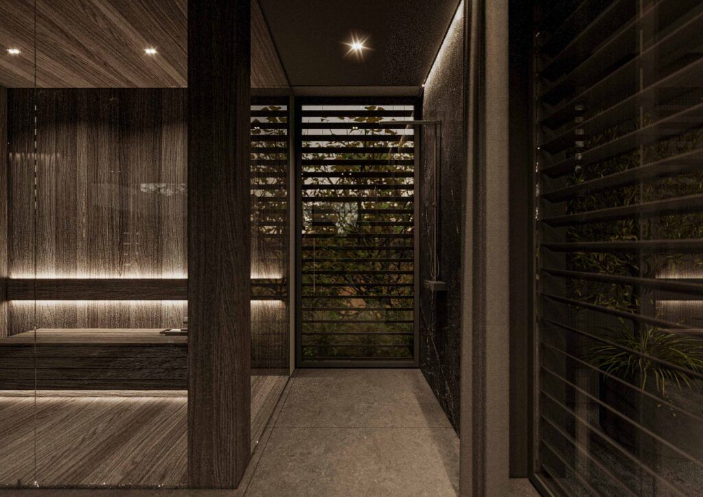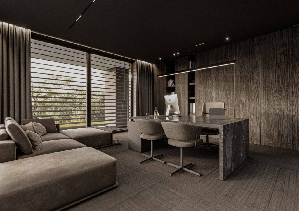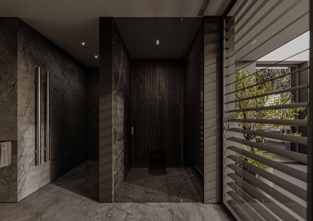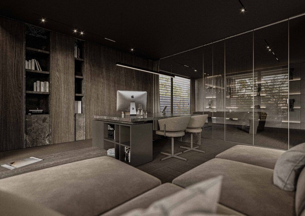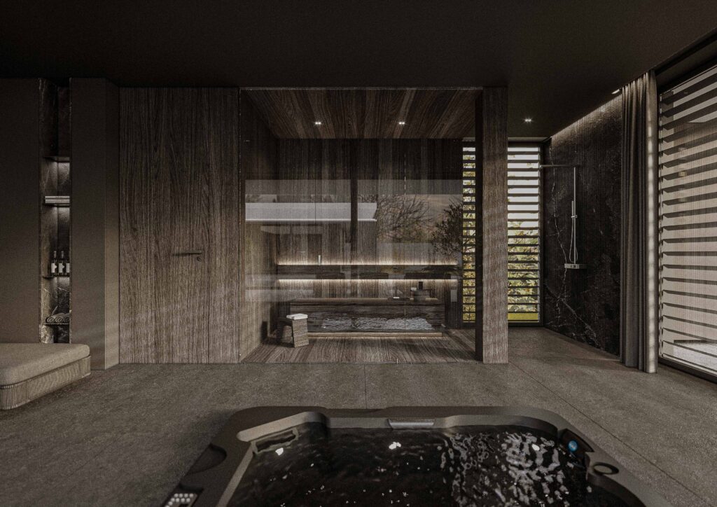 z basenem, sauną i siłownią, zaprojektowana jako domowa przestrzeń regeneracji. Willa posiada również niezależną przestrzeń biurową połączoną z showroomem, odpowiadającą potrzebom pracy i reprezentacji.